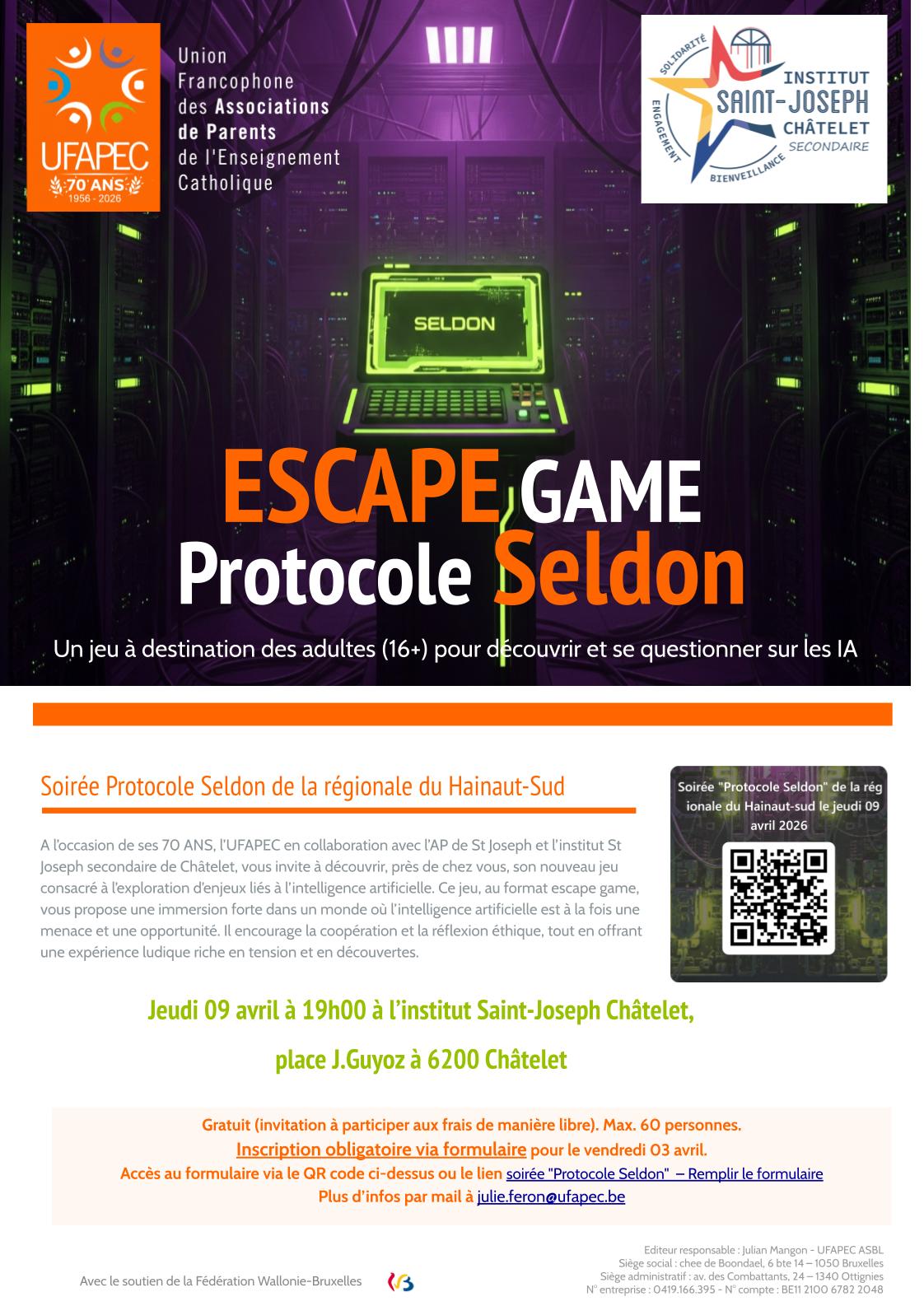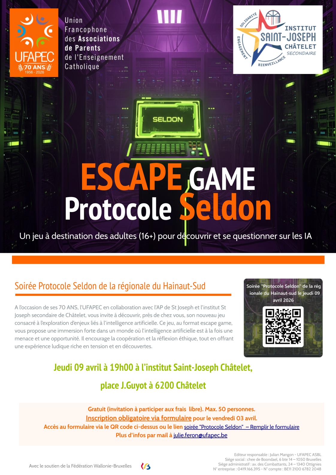 Protocole Seldon est une exploration ludique de certains aspects des intelligences artificielles (IA) via un jeu de type escape game virtuel. Il vous propose une immersion forte dans un monde où l’intelligence artificielle est à la fois une menace et une opportunité. Il encourage la coopération et la réflexion éthique, tout en offrant une expérience ludique riche en tension et en découvertes. Ce jeu s'adresse à un large public : autant en famille avec de grands ados (16 ans et +) qu'avec des amis ou en association de parents. Des animateurs pour adultes ou jeunesse (AMO, EPN, bibliothèques, ...) peuvent aussi s'emparer de ce jeu grâce à un carnet d'animation téléchargeable. Nous proposons également aux enseignants de 5e et 6e secondaire ou en haute école de s'y intéresser.