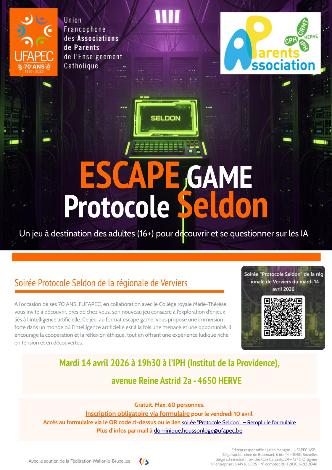 Inscription obligatoire via le formulaire en ligne : Soirée "Protocole Seldon" du 14 avril 2026 ou via le QR-code ci-contre