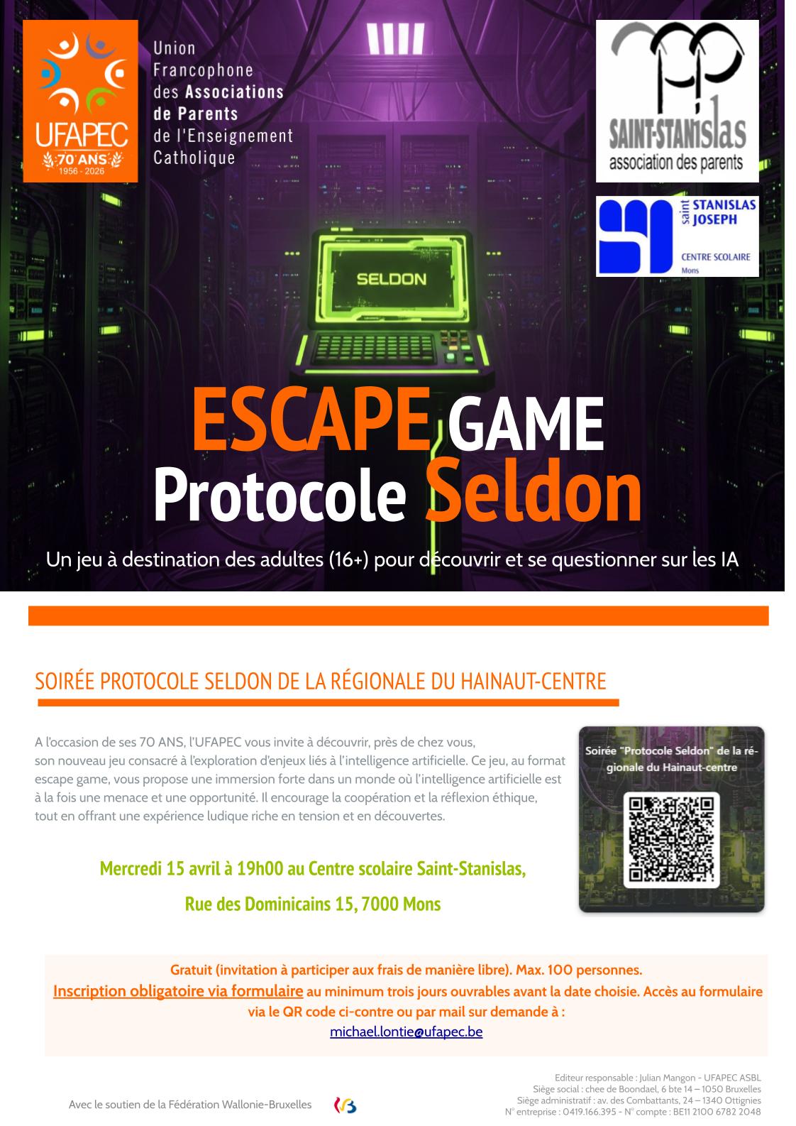 Protocole Seldon est une exploration ludique de certains aspects des intelligences artificielles (IA) via un jeu de type escape game virtuel. Il vous propose une immersion forte dans un monde où l’intelligence artificielle est à la fois une menace et une opportunité. Il encourage la coopération et la réflexion éthique, tout en offrant une expérience ludique riche en tension et en découvertes. Ce jeu s'adresse à un large public : autant en famille avec de grands ados (16 ans et +) qu'avec des amis ou en association de parents. Des animateurs pour adultes ou jeunesse peuvent aussi s'emparer de ce jeu grâce à un carnet d'animation téléchargeable. Nous proposons également aux enseignants de 5e et 6e secondaire ou en haute école de s'y intéresser.