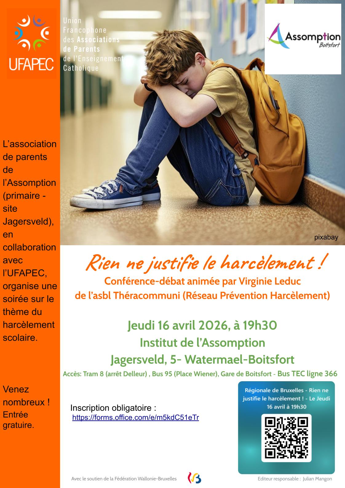 Organisation : L'association des parents de l'Institut de l'Assomption (primaire - site Jagersveld), en collaboration avec l'UFAPEC