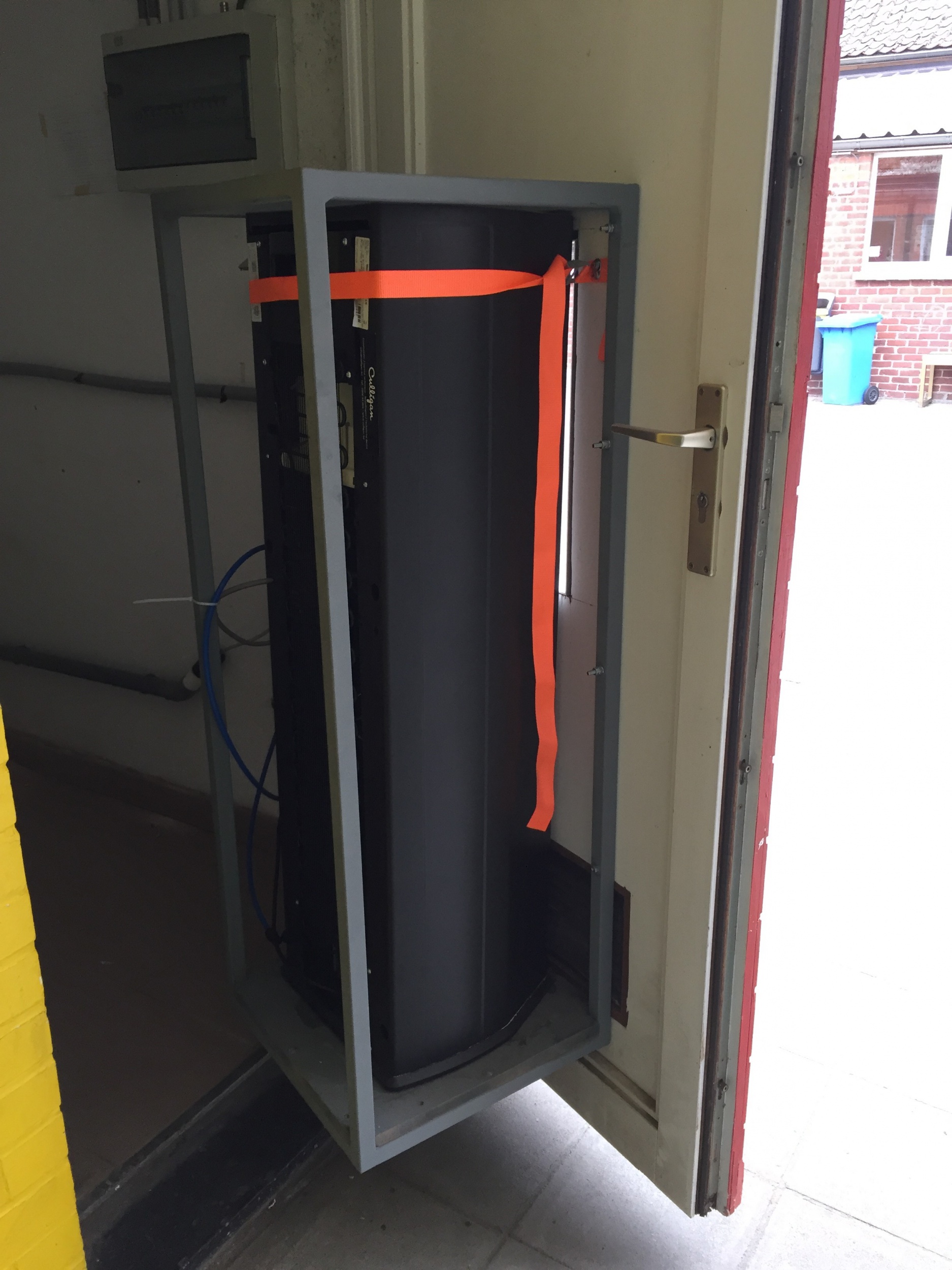 L’endroit choisi est sous un préau, le réservoir de la fontaine se situe dans un cagibi avec le distributeur à l’extérieur. Jean-Marie, l’ouvrier de l’école bricole un système très ingénieux dans la porte : pratique et efficace !! (voir photo) C’est lui qui se charge des raccordements nécessaires.